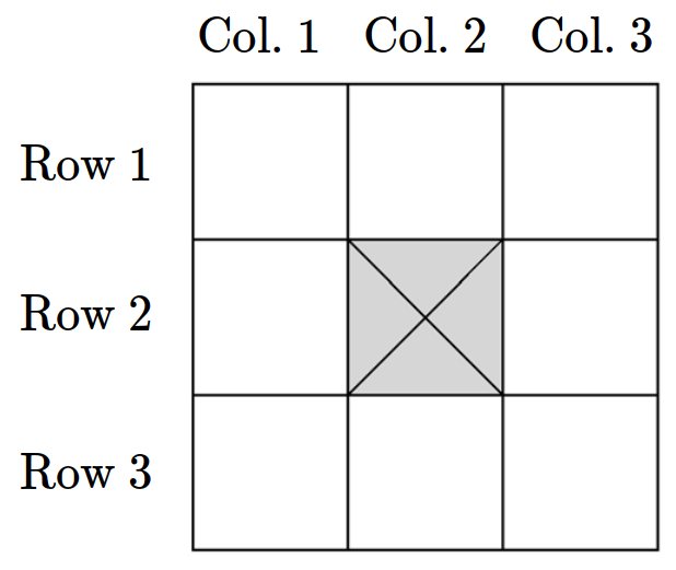 On the following seating chart, there are \(8\) available seats excluding the seat on row \(2\) column \(2\). Suppose we assign the seats to \(4\) female students and \(4\) male students, one seat each. The probability that at least \(2\) of the male students are assigned next to each other is \(p\). Compute \(70p\). (※ Two students are ‘next to each other’ if they are adjacent within the same row or the same column.) [4 points]