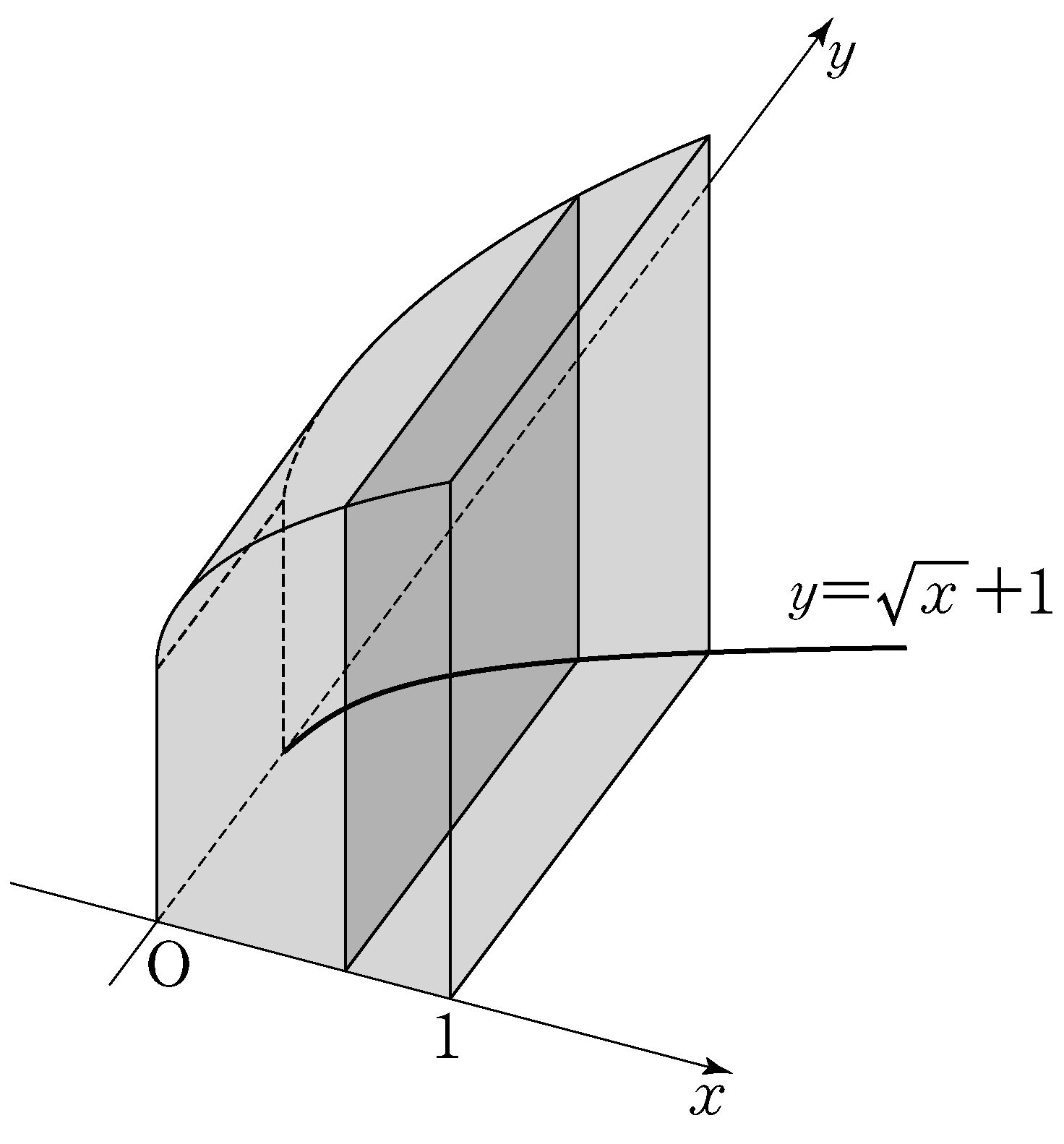 As the figure shows, there is a \(3\)-dimensional solid where one of its faces is the region enclosed by the curve \(y=\sqrt{x}+1\), the \(x\)-axis, the \(y\)-axis, and the line \(x=1\). Suppose a cross section of this solid and any plane perpendicular to the \(x\)-axis is always a square. What is the volume of this solid? [3 points]