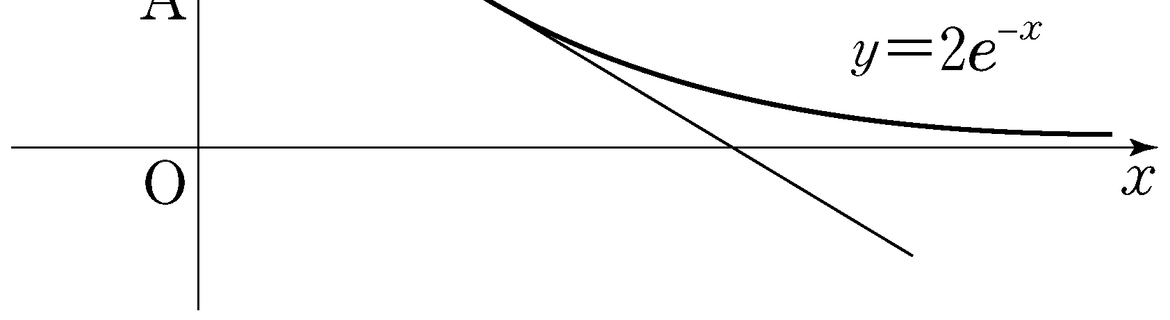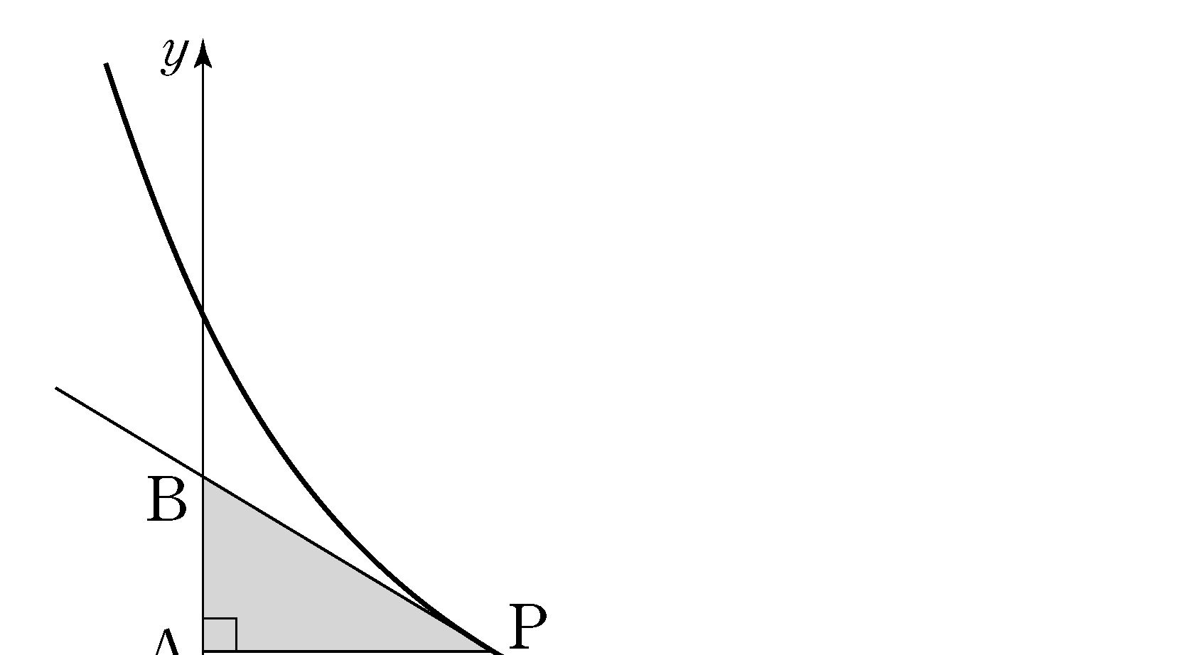 For a point \(\mathrm{P}(t,2e^{-t})\) on the curve \(y=2e^{-x}\), let \(\mathrm{A}\) be the perpendicular foot from point \(\mathrm{P}\) to the \(y\)-axis, and let \(\mathrm{B}\) be the point where the tangent line at point \(\mathrm{P}\) meets the \(y\)-axis. What is the value of \(t\) for which the area of the triangle \(\mathrm{APB}\) is the greatest? [4 points]