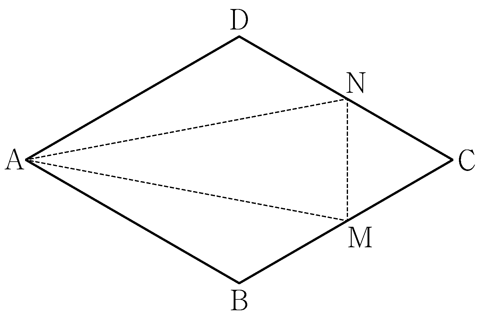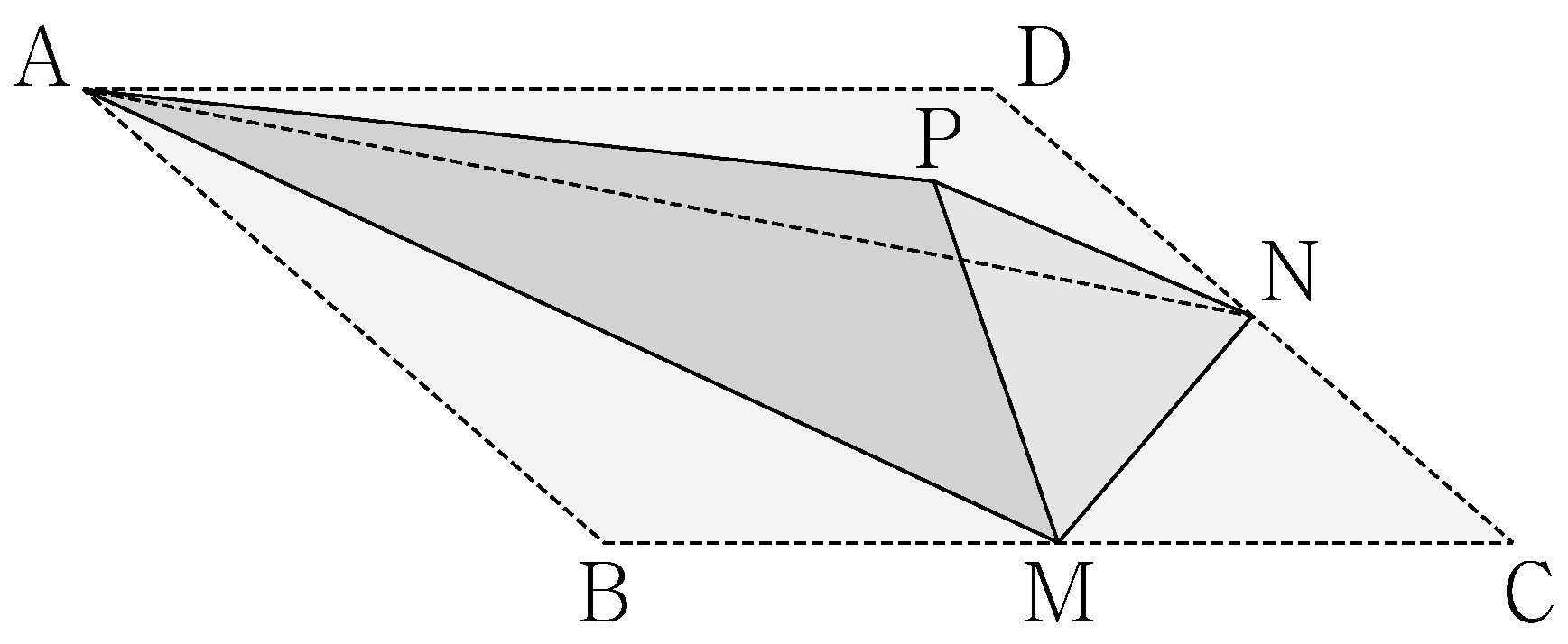 As the figure shows, there is a piece of paper in the shape of a rhombus \(\mathrm{ABCD}\) with side lengths of \(4\) where \(\angle\mathrm{BAD}=\dfrac{\pi}{3}\). Let \(\mathrm{M}\) and \(\mathrm{N}\) be the midpoints of edges \(\mathrm{BC}\) and \(\mathrm{CD}\) respectively. Suppose we fold the paper along the line segments \(\mathrm{AM}, \mathrm{AN}\) and \(\mathrm{MN}\) to create the tetrahedron \(\mathrm{PAMN}\). The projection of the triangle \(\mathrm{AMN}\) onto plane \(\mathrm{PAM}\) has an area of \(\dfrac{q}{p}\sqrt{3}\). Compute \(p+q\). (※ Ignore the thickness of the paper. Point \(\mathrm{P}\) is where the three points \(\mathrm{B, C}\) and \(\mathrm{D}\) meet when the paper is folded. \(p\) and \(q\) are positive integers that are coprime.) [4 points]
